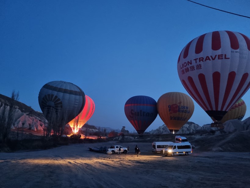 카파도키아에 도착한 다음날 새벽 5시 30분에 우리를 픽업하러 온 미니버스에 옹기종기 올라 열기구 탑승 포인트로 이동했다. 이전 이틀 동안 나쁜 날씨상황으로 인해 열기구가 날지 못했단다. 어두운 산길을 한참 달리니 이미 많은 사람들이 먼저 와 기다리고 있었고 여전히 어두웠지만 준비된 따듯한 차를 나누어 마시며 가슴 부푼 대기시간을 즐겼다.