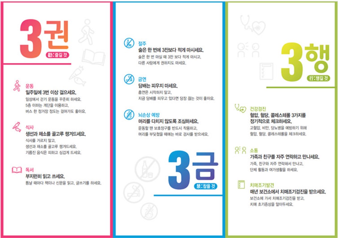 혈압, 혈당, 콜레스테롤을 정기적으로 체크해야 합니다. 20-79세에 제 2형 당뇨를 진단받은 사람은 그렇지 않은 그룹에 비해 치매위험이 1.46배 높아지고, 35-64세에 고혈압을 앓게 된 사람은 치매위험이 1.61배, BMI가 30kg/㎡ 이상 비만이 된 성인은 치매위험이 1.6배 증가합니다.