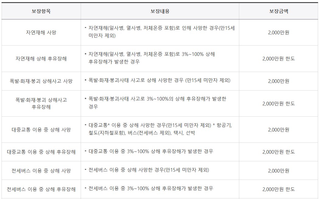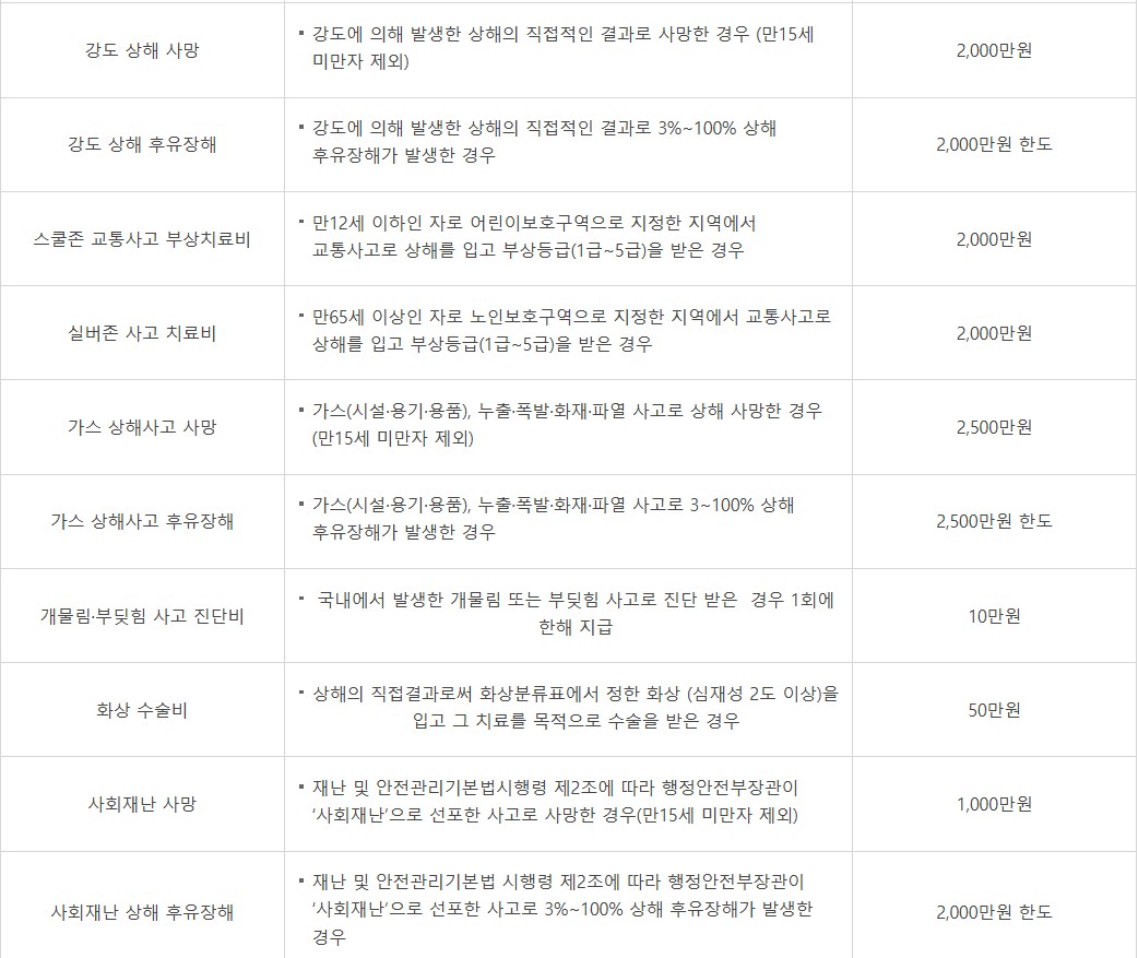 재난 또는 사고로 인한 사망 또는 후유장해, 부상치료비를 지원합니다. 대구시 뿐 아니라 다른 지역에서 발생한 사고에 대해서도 지원이 됩니다. 다만, 해외 발생 사고는 보장항목별로 다르기 때문에 콜센터(☎120)로 문의하시기 바랍니다.